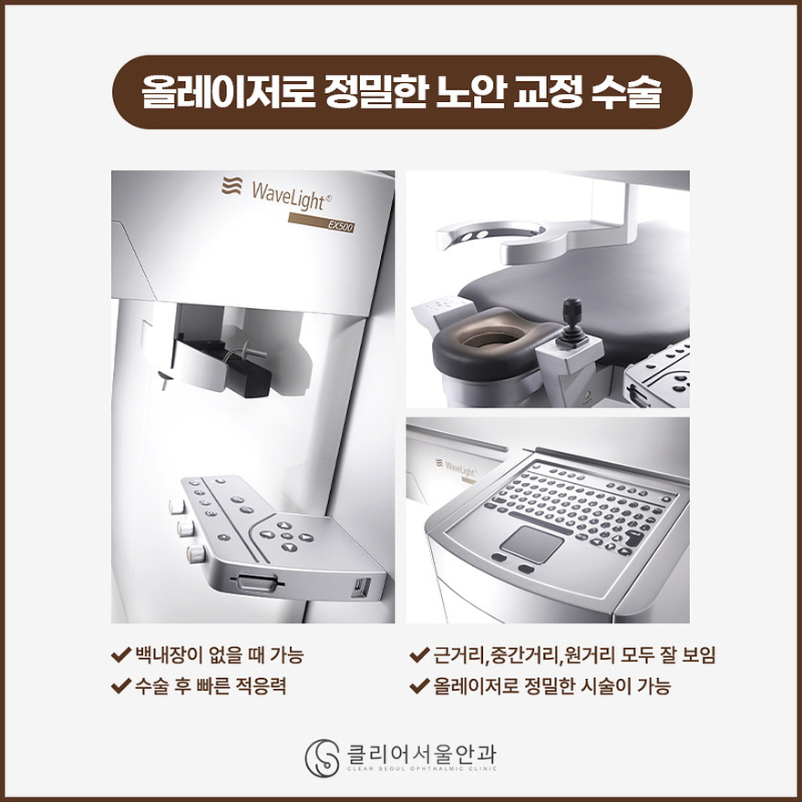 하지만 노화로 인해 백내장까지 진행되는 경우라면 수술 방법 및 비용이 달라질 수 있기 때문에 검사 후 상담을 통해서 현재 눈 상태를 고려한 수술 방법을 진행하는 것이 좋죠.