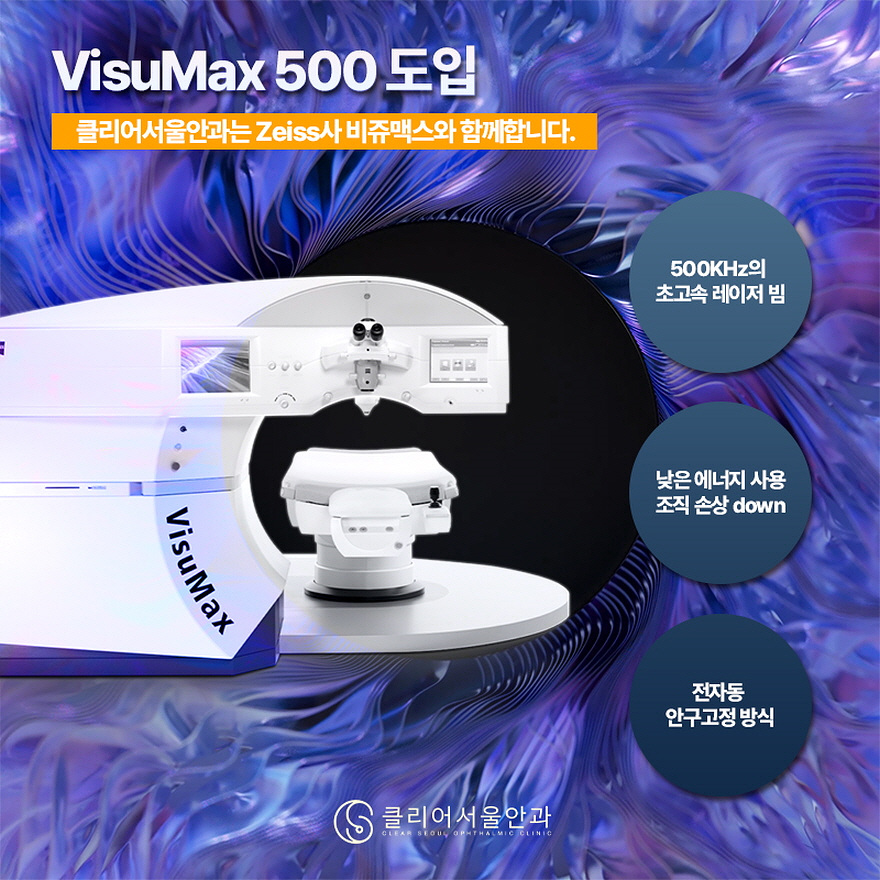 스마일 라식의 경우 비쥬맥스라고 하는 장비를 사용해서 수술이 이루어지고 있는데요. 500KHz에 해당하는 빠른 레이저 조사 속도를 보유하고 있고, 낮은 레이저 에너지를 사용하고 있기 때문에 각막 조직 손상의 우려까지 낮출 수 있게 되었습니다.