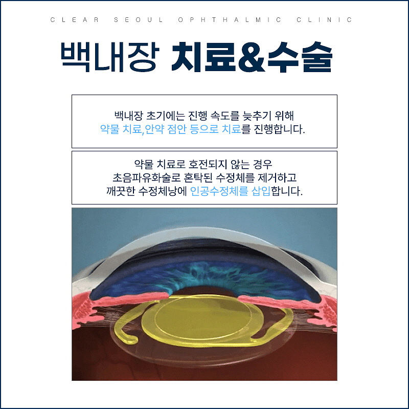 보통 초기로 진행되고 있는 상태라면 약물을 써서 빠른 진행을 억제할 수가 있습니다. 그러나 중기 이후에는 무조건 수술이 필요하다 볼 수 있으며 백내장수술시기 또한 중기 이후로 보고 있습니다. 이미 수정체는 혼탁한 상태이기 때문에 더 나아지는 경과를 기대할 수 없을 텐데요. 따라서 초음파 유화술로 혼탁한 수정체를 정리하고, 인공 수정체를 삽입할 수 있습니다.