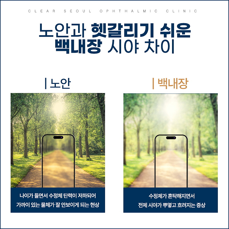 우리들의 눈 역시 건강한 상태가 영구적으로 보존되는 것이 아니기 때문에 살아가면서 시력 저하를 느낀다거나 시력 저하로 넘길 수 없을 정도의 불편한 증상들이 하나 둘 생겨날 수 있습니다. 가장 흔한 변화라고 한다면 가까운 거리가 잘 보이지 않는 것과 전체적인 시야가 뿌옇게 흐려지는 것을 생각할 수 있으며 가급적 검사를 받아보며 어떤 이유로 증상이 나타난 것인지 확인해 보는 것이 좋습니다.