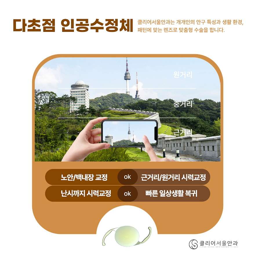 백내장 수술 시 사용되는 인공 수정체 종류 중 다초점은 단 초점과 다르게 여러 곳에 해당하는 초점을 모두 가지고 있는데요. 결정적으로 노안 시력을 교정하는데 도움되기 때문에 노안, 백내장 치료를 원하는 분들이 선호하는 방법입니다. 다초점 인공 수정체 역시 종류가 다양하기 때문에 상담을 진행하면서 적절한 인공 수정체를 선별하는 것이 가장 중요합니다.